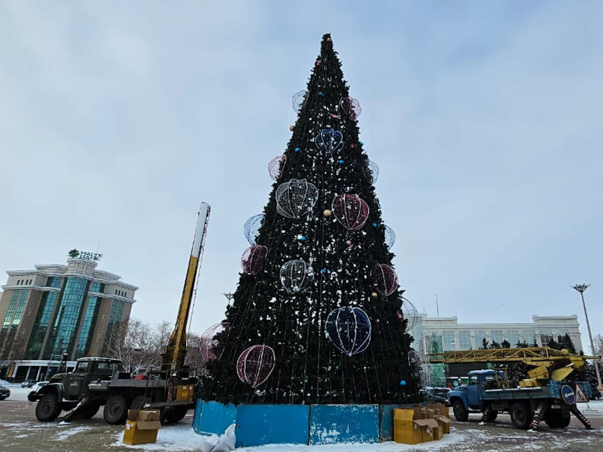 В областном центре продолжается украшение новогодней ёлки на площади Республики, передает YK-news.kz.